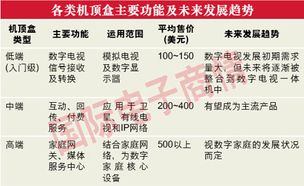 由于各国积极切入数字电视产业,加上北美及欧洲在2007年后将陆续终止传送模拟信号,随着数字电视用户数的增加,网络功能、移动接收及新的应用服务出现,加上2008 年奥运等因素,都将刺激数字机顶盒市场需求的上扬。根据市场研究机构In-Stat预测,到2008年,各种数字机顶盒(卫星、有线、地面广播、IP)市场需求量合计仍有约1.33亿台的市场。卫星机顶盒和有线机顶盒因市场比较成熟,虽然成长空间相对较小,但仍是数字机顶盒市场的主流产品。