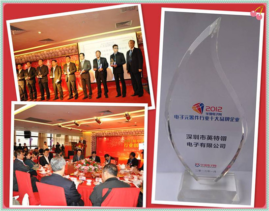 2013年1月15日,应华强集团、华强电子网的邀请,英特翎集团总裁王乌海先生参加了“2013年中国电子元器件行业创新发展年会暨2012华强电子网‘优质供应商 ’颁奖盛典”。英特翎电子公司喜获“电子元器件行业十大品牌企业”的称号。