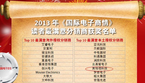 • 恭贺英特翎科技荣获2013十大“最满意本土授权分销商”